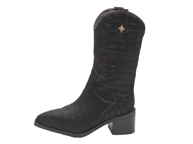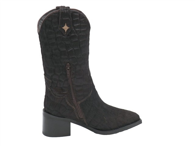 IQONIC hippe en trendy dames westernlaars. Deze laars van IQONIC heeft als modelnaam Uma en het artikelnummer is 1.05. De kleur is donkerbruin in het ponyhair met een subtiele print. De voering is een zachte velourse voering met een lederen inlegzool. De laars heeft een halve ritssluiting aan de binnenzijde en een hakhoogte van 4,5cm.