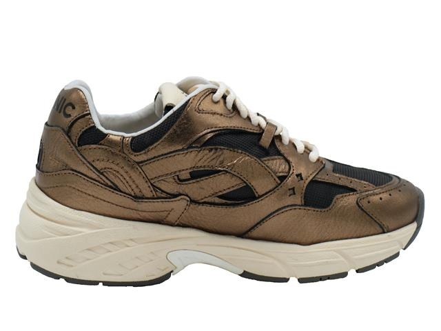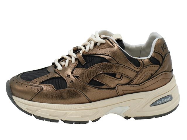 IQONIC hippe en trendy dames sneaker. Deze veterschoen van IQONIC heeft als modelnaam Ease en het artikelnummer is: EASE 1.05. De kleur is gold oftewel goud gecombineerd met zwart en ecru. Het materiaal is een combinatie van leer en mesh. De voering is van synthetisch leer en de schoen heeft een uitneembaar voetbed
