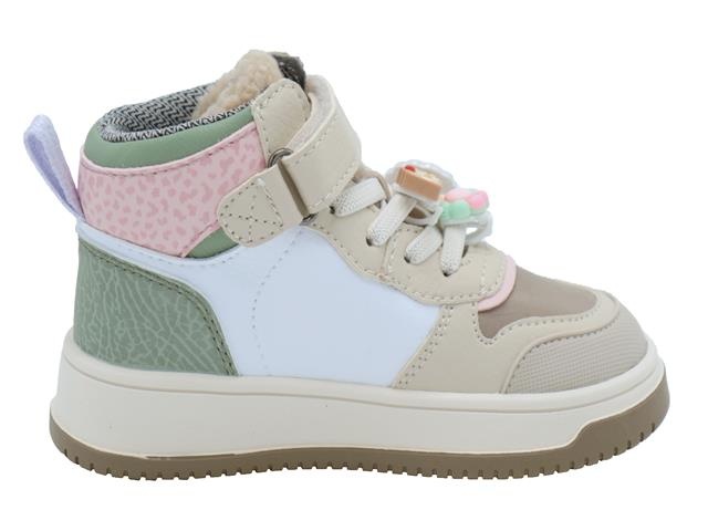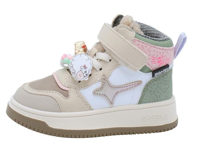 Shoesme stoere en comfortabele halfhoge meisjes veterschoen. Deze high top sneaker van Shoesme heeft als modelnaam New Outsole en het artikelnummer is: NO25W100-G. De kleur is taupe pink oftewel taupe met wit en roze accenten in het synthetisch leer. De voering is een tex voering wat ervoor zorgt dat de schoen waterdicht oftewel waterproof is. De sluiting is een elastieke vetersluiting met een klittenbandsluiting. Daarnaast zitten er leuke dingen op de veter, deze kunnen eraf.